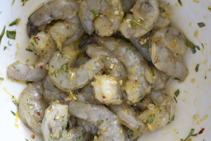 If you intend to skewer the shrimp, soak the wooden skewers in a pan of water for at least 4 hours. If you will also be making vegetables on the skewers, be sure to soak enough to accommodate your needs. Combine the minced garlic, crushed red peppers, tarragon, salt, pepper, and lemon zest in a medium-large size bowl. Use a spoon to mix the marinade together. Add the cleaned shrimp to the marinade and gently stir to coat all of them. Cover with plastic wrap and refrigerate for 3-8 hours. About an hour prior to cooking or grilling, remove from the refrigerator and squeeze the reserved juice of 1 lemon over the shrimp. Stir or toss to incorporate. If you are using the skewers, carefully pierce each shrimp from the widest part of the tail through to the smallest as I have done in the photos here which will allow them to cook evenly. You should be able to fit 4-6 shrimp onto each skewer. Cut the vegetables into 1-1 1/2 inch chunks. Alternate them on the skewers in a pattern such as onion-pepper-onion or mushroom-zucchini-mushroom. If you do not want to be bothered with cutting and skewering the vegetables, they will be just as good sliced and grilled with a sprinkling of lemon juice and sea salt. Heat the grill to medium heat. If you are grilling vegetables, start them at least 15 minutes before the shrimp. The shrimp will only take a few minutes to cook so they should be the last thing you do. Lay the skewered shrimp onto the grill. Cook on each side for about 3 minutes or until the side being grilled starts to turn pink. It is best to pull them off the grill before they begin to curl. Please note that the shrimp pictured here is a bit more cooked than I would consider optimal. Serve immediately. If you do not have a grill, use a stove top grill pan. If that is something you do not have either, roast the vegetables and broil the shrimp in the oven. |