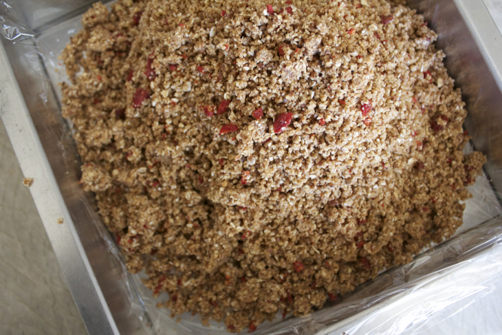 Combine the oats, coconut, flax seeds, almond butter, maple syrup, and sea salt in the bowl of a food processor. If you do not have a food processor, use a mixing bowl and combine by hand. Process the ingredients for about 20-30 seconds until they come together enough to form balls that will not crumble apart. If you are combining the ingredients by hand, it may take about 5 minutes to mix the ingredients to the point that you can form a ball as the mixture is very sticky to handle. If the mixture seems to be too dry and will not come together without crumbing apart, add a bit more nut butter or maple syrup little by little until the consistency is becomes more pliable. Add the goji berries and pulse or mix until they are completely mixed in. If you are rolling the mixture into balls, which is my personal preference, use a tablespoon or 1 inch cookie scoop to measure the dough. Roll and pat the mixture in your hands until the balls are firm and not crumbly. They should be about 1.5 inches in diameter. The recipe yields 30. If you prefer to make bars, line a 8 inch baking pan with plastic wrap and press the mixture firmly and evenly into it. Chill the mixture in the refrigerator for about 10 minutes. Carefully remove the pressed dough from the tray by lifting the edges of the plastic wrap. Cut into 30 squares by slicing the block into 6 sections one direction and 5 sections perpendicularly. Store the balls or the bars in an airtight container in the refrigerator. |